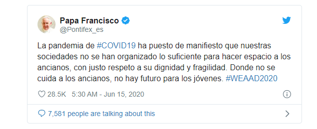 “La pandemia de COVID 19 ha puesto de manifiesto que nuestras sociedades no se han organizado lo suficiente para hacer espacio a los ancianos, con justo respeto a su dignidad y fragilidad. Donde no se cuida a los ancianos, no hay futuro para los jóvenes”, fue el mensaje del Pontífice publicado en su perfil de la red social Twitter.